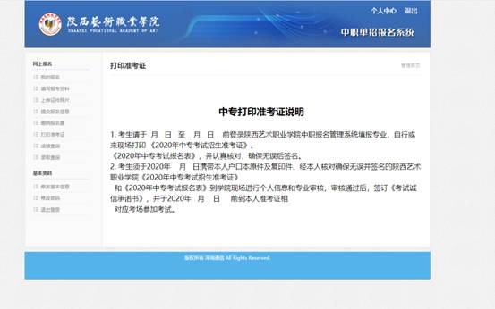 符合报考条件的考生请于2020年6月24日8∶00至7月2日17∶00,登录陕西艺术职业学院招生信息网(http//:zsw.sxavc.com)点击中专、五年一贯制报名系统(http://zs.51uns.com:8811/Pro_BM/UserZz/ZzLogin.aspx),进行网上报名,专业填报、缴纳考试费、打印准考证。