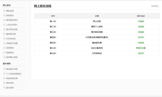 在我的报名界面,学生可以看到报名流程,学生可以在该页面查看自己进行到哪一步,可以根据此流程进行数据填写及上报。